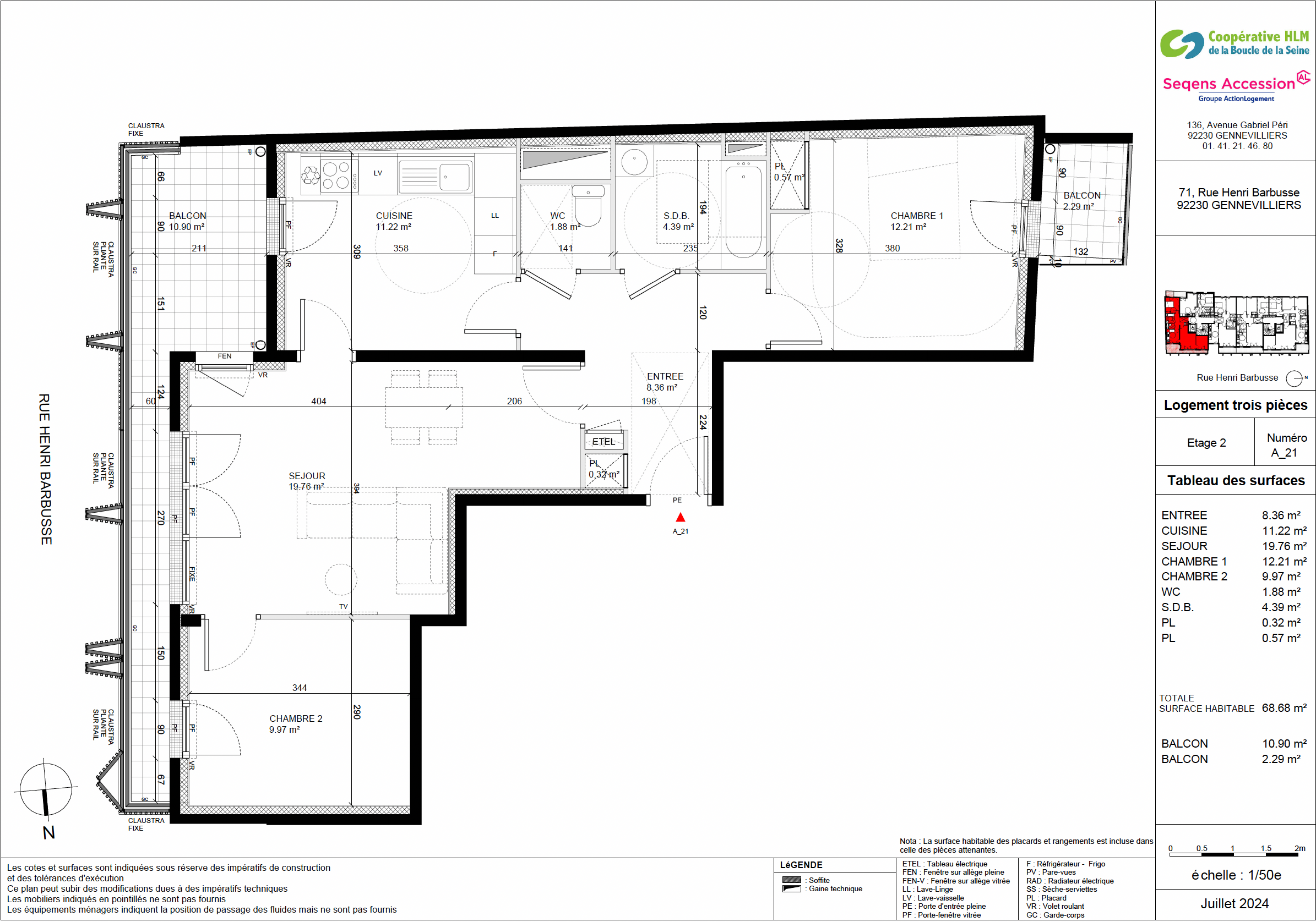 Appartement au 4ème étage de 68,67m2 traversant (Est/Ouest), séjour de 19,75m2 donnant sur un balcon-terrasse de 10,89m2 avec cuisine de 11,22m2. L’appartement dispose de 2 chambres dont une de 11,21m2 donnant sur un petit balcon de 2,29m2, une entrée, wc et salle de bain.