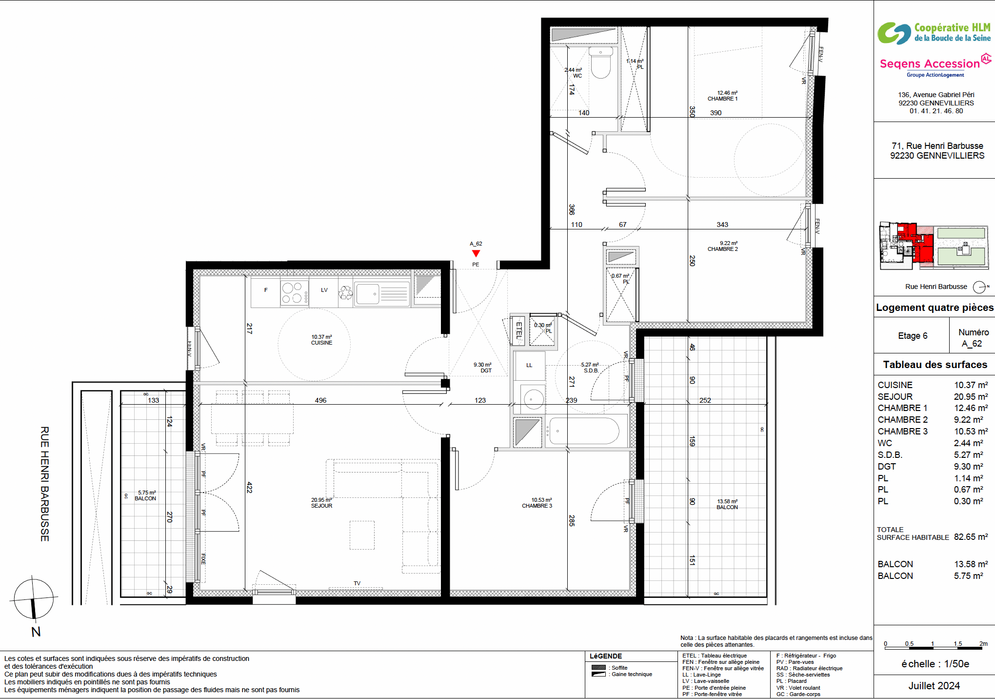 Appartement de 82,65m2 au 6ème et dernier étage avec double orientation Est/Ouest, composé d’un séjour de 20,95m2 et d’une cuisine de 10,37m2 donnant un balcon de 5,75m2. Le bien comporte 3 chambres dont une de 10,53m2 donnant sur un beau balcon de 13,58m2, un WC et une salle de bain.