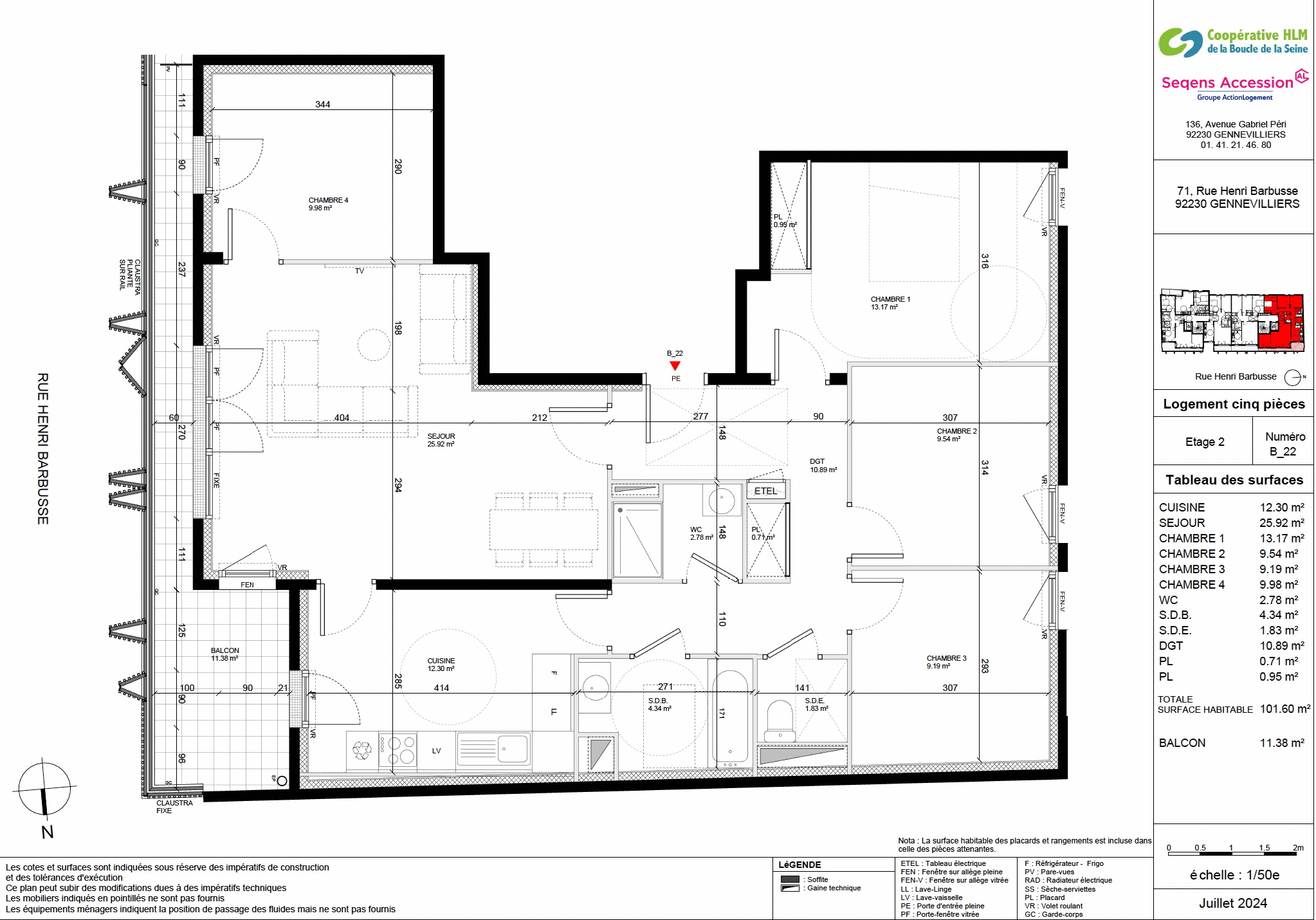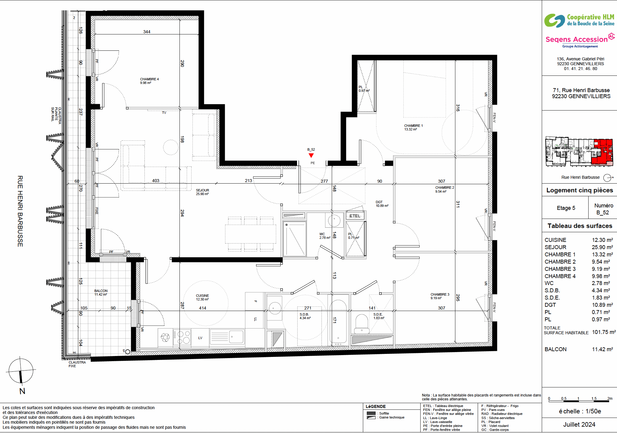 Appartement de 101,75m2 au 4ème étage avec une double orientation Est/Ouest, composé d’un séjour de 25,91m2 et d’une cuisine de 12,31m2 donnant un balcon de 11,39m2. Le bien comporte 4 chambres, un WC, une salle d’eau et une salle de bain.