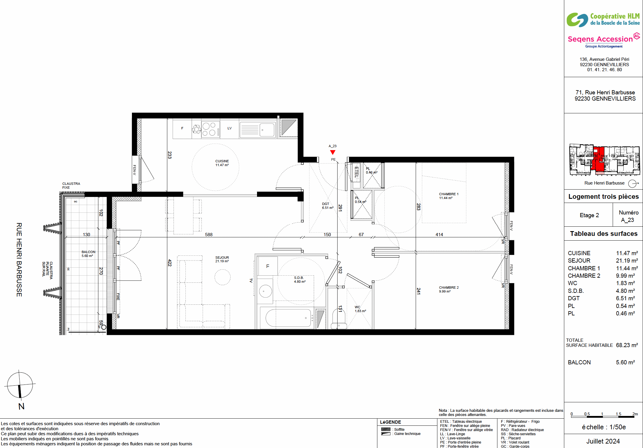 Appartement au 5ème étage de 68,23m2 traversant (Est/Ouest), séjour de 21,19m2 donnant sur un balcon de 5,60m2 et une cuisine de 11,47m2. L’appartement dispose de 2 chambres de 11,44m2 et 9,99m2, une entrée, wc et salle de bain.